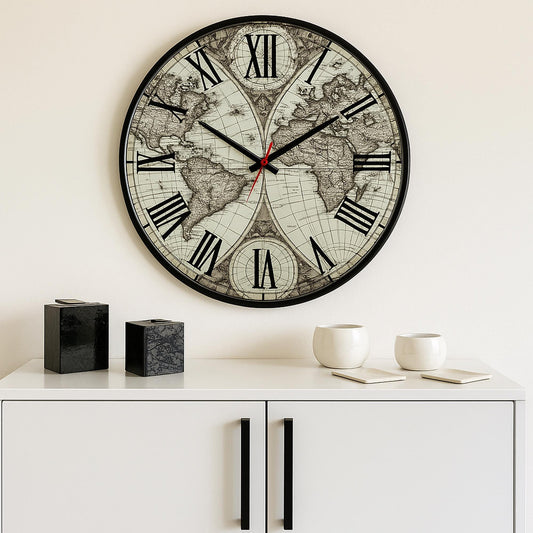 Mirror Wall Clock with Antique World Map & Roman Numerals, Handmade Artistic Glass Design